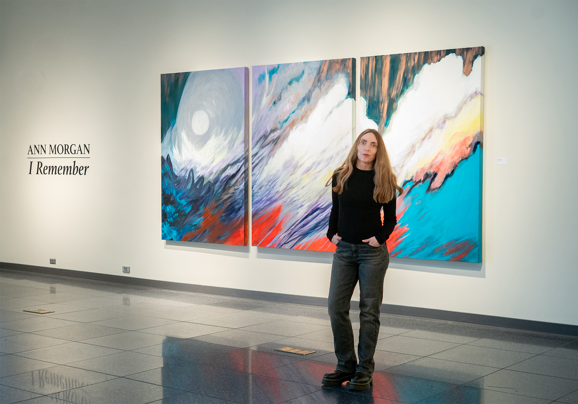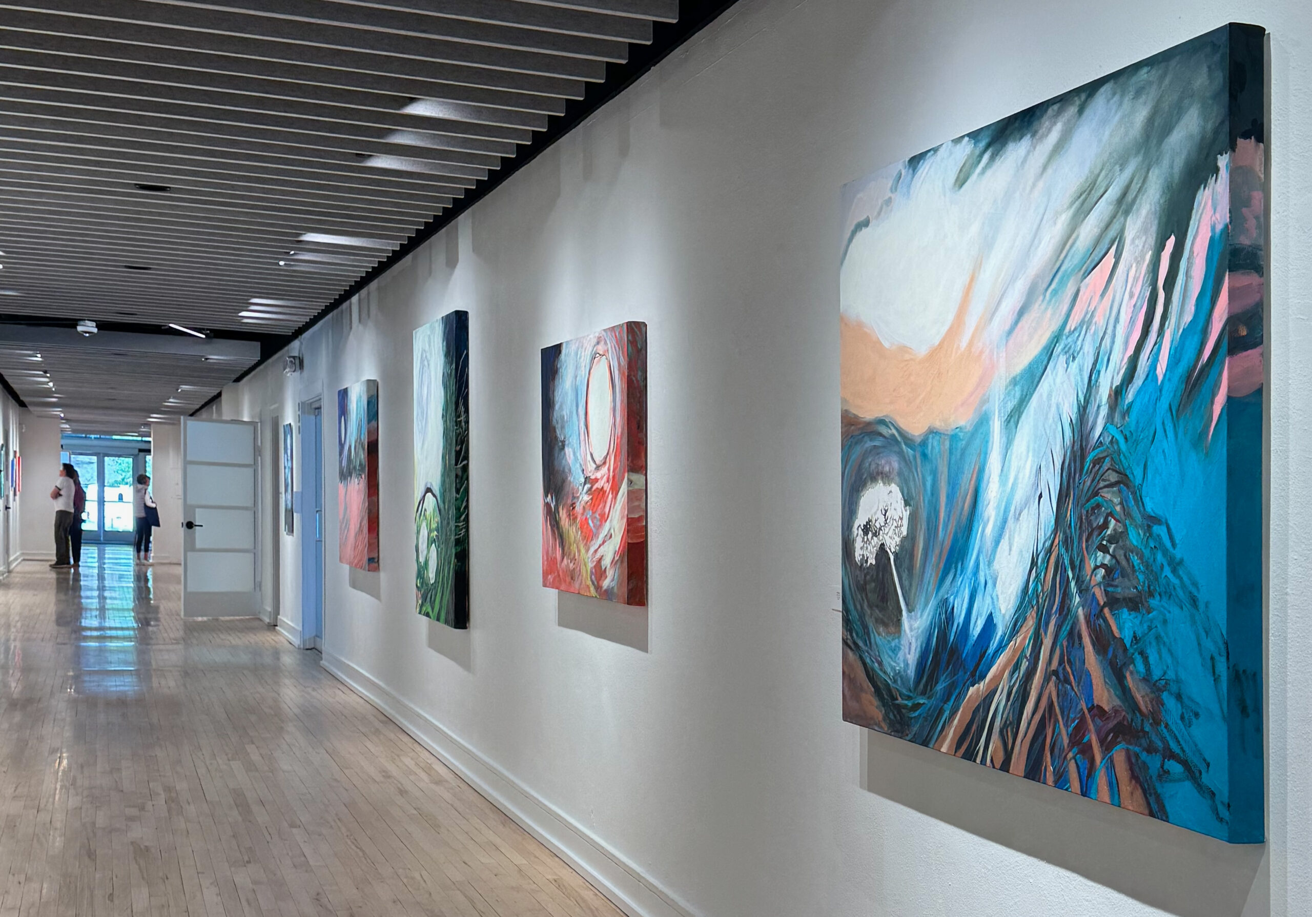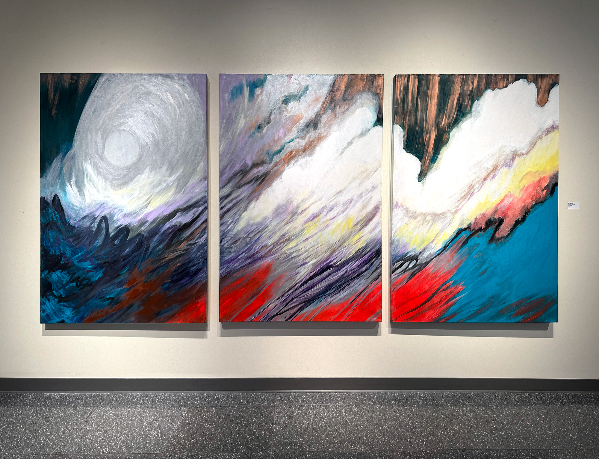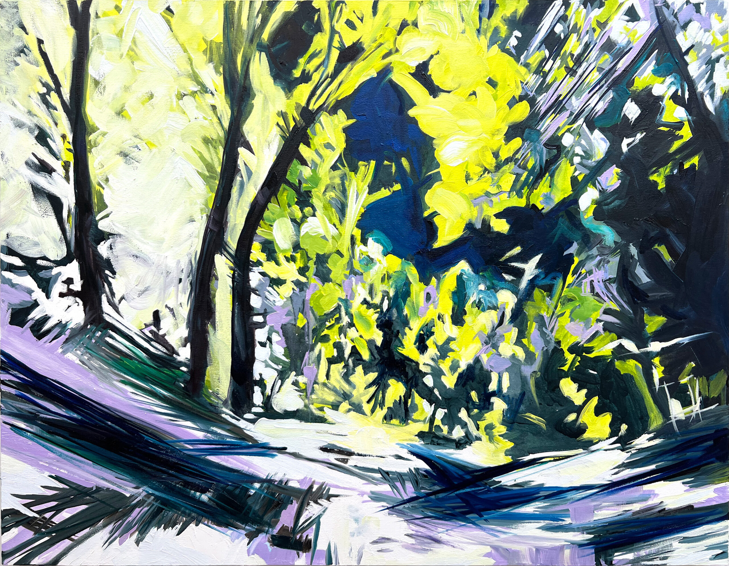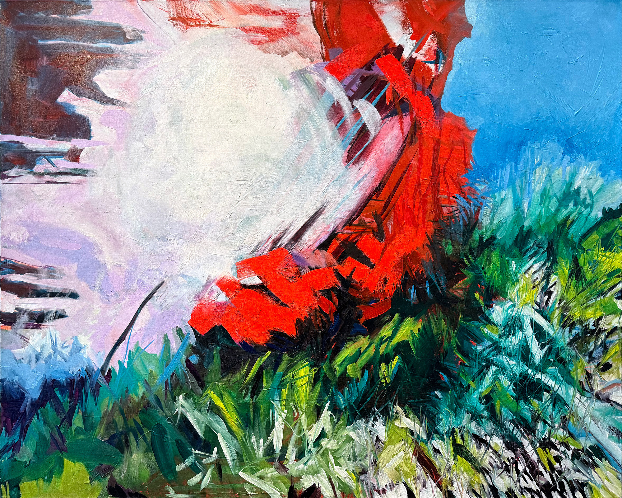 I paint large to take up space unapologetically, without asking permission. I use horizons, water, sun, moon, and stars to anchor the paintings to memory, to the body and the physical world, while layers of oil paint reflect the abstract noise of digital reality. Early marks remain visible as later ones build over them, allowing each painting to function as a record of time rather than an image of it – and in opposition to the speed and blur of our virtual lives.