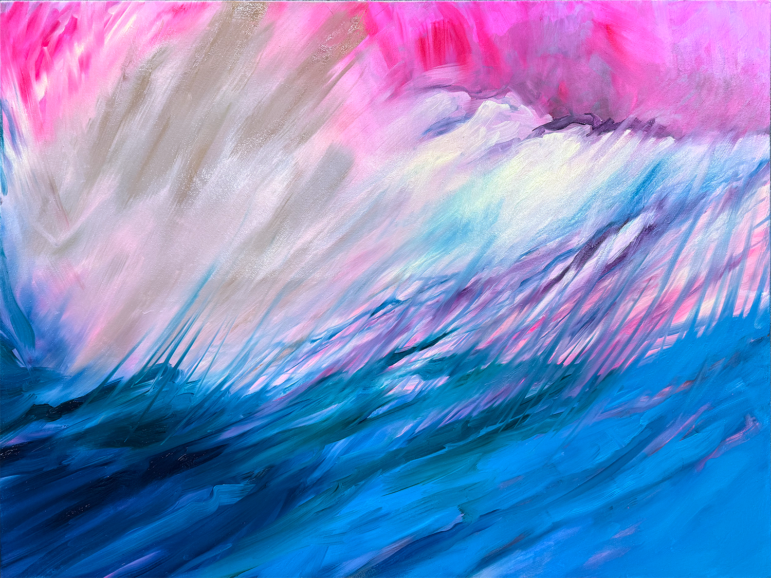 The second painting is part of my ongoing Hours Ago series, where titles mark the duration since a life-changing event without naming what the event was. This canvas is about 30% finished. The palette has moved away from red into pinks, magentas, and deep teals. The diagonals are still there, but they’re not crashing — they’re dispersing and I don’t know if they’ll be on the final painting. There’s no single compositional eye yet. The painting is still figuring out what it is.