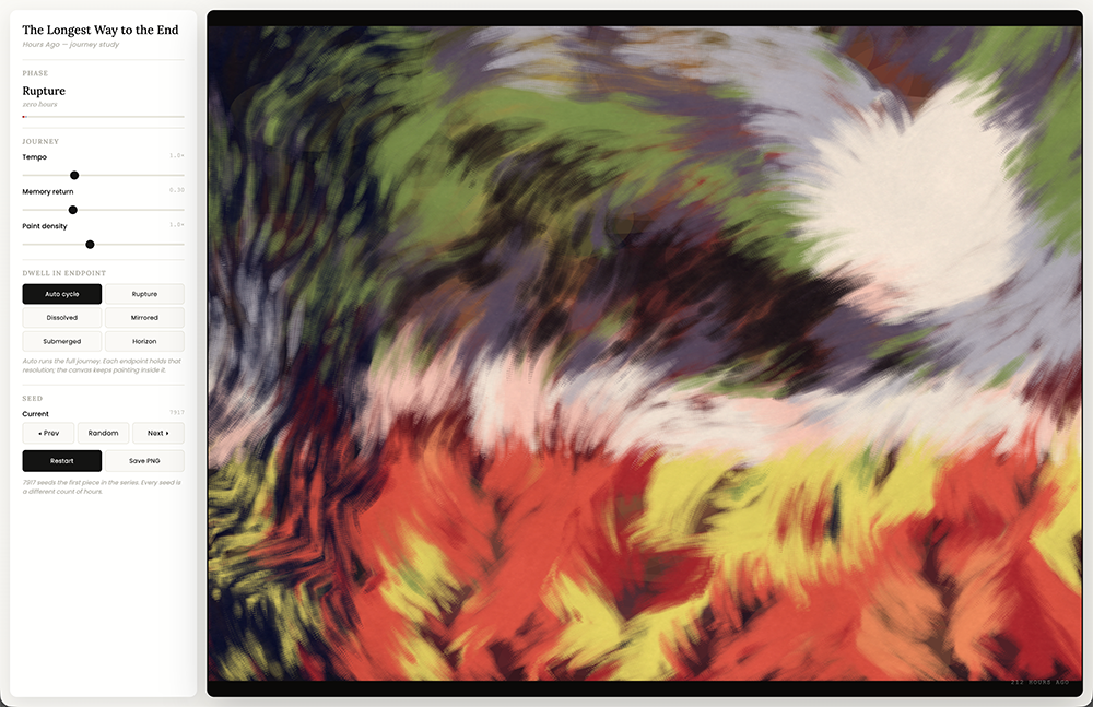 The first version had a sidebar with controls: tempo, memory return, paint density, seed navigation, and buttons to lock the piece into any of the four endpoint states. Useful for understanding the algorithm, but not what the work should be.